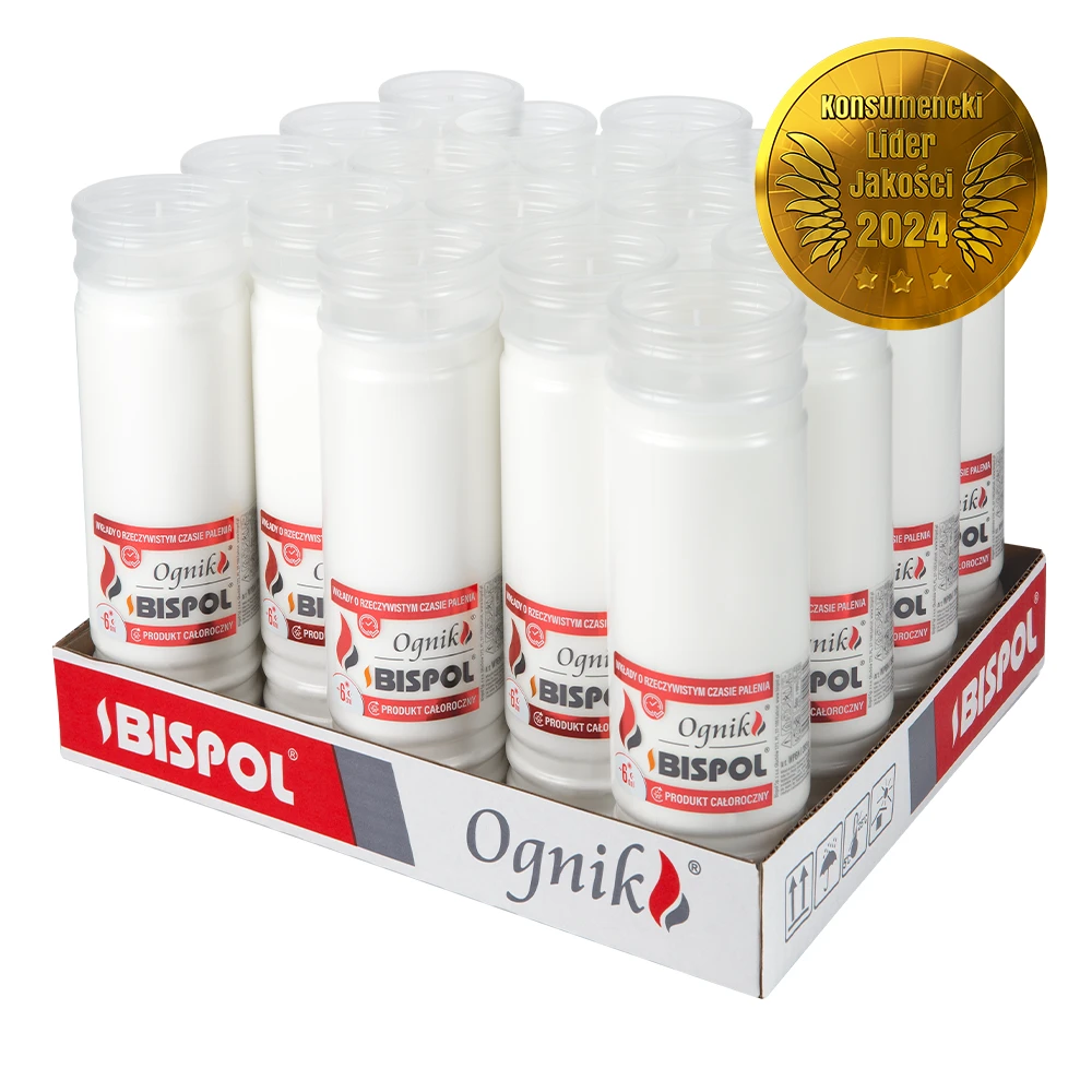 Zalewane wkłady 6-dniowe to propozycja dla osób, które cenią czystość spalania, długi czas palenia i powtarzalną jakość. Dzięki czasowi palenia do 144 godzin wkłady zapewniają długotrwałe światło bez konieczności codziennej wymiany. Zalewana masa palna wypala się równomiernie. Wysokość 21 cm i średnica 6,3 cm sprawiają, że wkłady pasują do większości wysokich modeli zniczy. Nowa biała obudowa prezentuje się elegancko i neutralnie, nadając całości schludny wygląd. Wkłady o rzeczywistym czasie palenie mogą być stosowane przez cały rok – dobrze radzą sobie zarówno latem, jak i w niskich temperaturach. Zgrzewka (taca) zawiera 18 sztuk, co pozwala na zaopatrzenie się na dłuższy czas. To dobre rozwiązanie na święta, rocznice i codzienne odwiedziny na cmentarzu. Dzięki wysokiej jakości wykonania wkład całoroczny sprawdza się w różnych warunkach atmosferycznych, niezależnie od intensywności wiatru czy opadów. Wydajność, stabilność płomienia i brak zapachu czynią z niego niezawodny element każdego znicza.